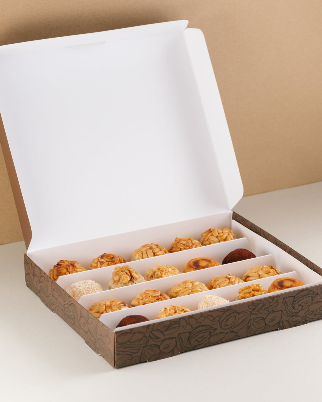 La variedad de panellets surtidos es lo que hace que esta caja sea única. Podrás elegir entre almendra, piñones, coco, chocolate, café, yema, pistacho, nueces del país y nueces pecanas, lo que garantiza que todos los gustos estén cubiertos. Cada panellet es una pequeña obra de arte, elaborada con atención al detalle para asegurar un sabor auténtico y una textura perfecta.